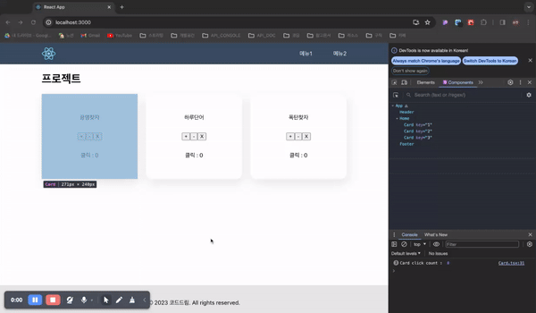 카드가 렌더링될 때 마다 로그가 찍히는 것을 보니 상태가 변할 때에도(리렌더링이 발생하게 되면서) 역시 로그가 찍힐 것 같습니다.