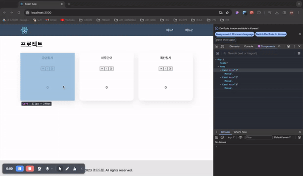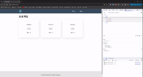 카드 영역을 클릭하면 테두리가 활성화되고 있습니다. 이 테두리는 컴포넌트가 리렌더링이 되는 것을 의미합니다.